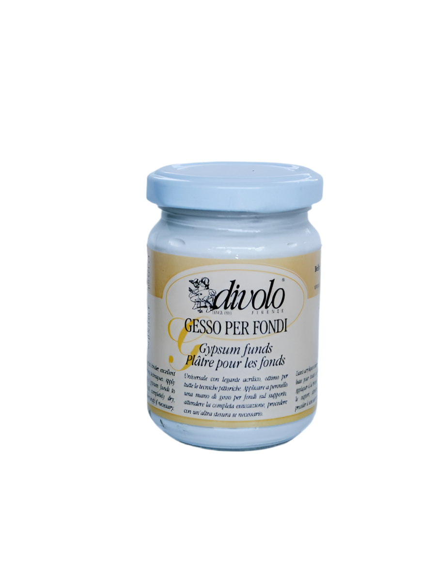 DESCRIZIONE: Il Gesso per Fondi è un prodotto a base acquosa, di colore bianco, molto coprente, composto da carbonato di calcio e resina acrilica di ottima qualità.  Il prodotto si può utilizzare come fondo su qualsiasi materiale come tela, muro, legno, carta, polistirolo, ecc.
