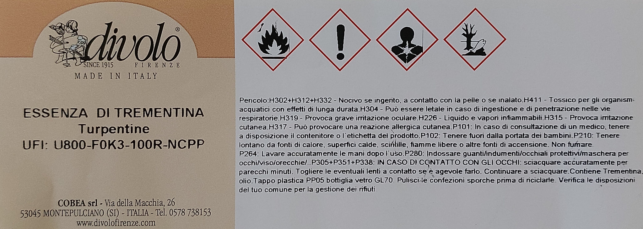 DESCRIZIONE: L’Essenza di Trementina è un prodotto di origine vegetale dal caratteristico profumo di pino, l'essenza di trementina è la parte volatile che si ottiene dalla distillazione della resina di alcuni pini. E’ un solvente organico, idrocarburo terpenico, a polarità medio-bassa.